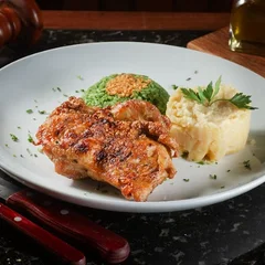 Deliciosa sobrecoxa desossada do Dom Hélio, assada com nosso tempero especial. Escolha 2 acompanhamentos para completar essa experiência de sabor!